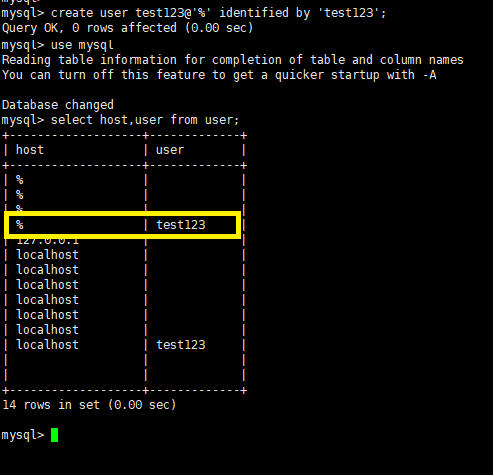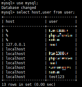 해당 select query를 실행 하면 아래와 같이 신규로 추가된 test123 이라는 계정이 보입니다.
