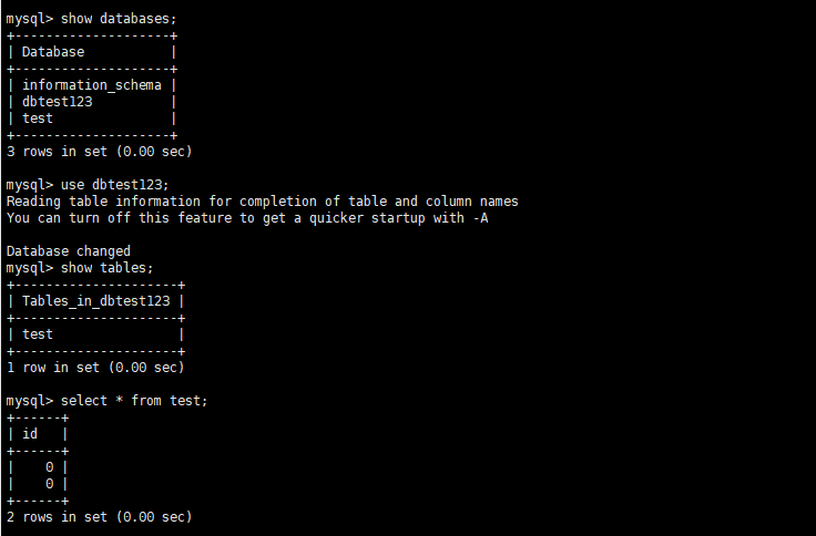 다시 test123 으로 접속을 하게 되면 아래와 같이 dbtest123에 접속이 가능하게 됩니다.