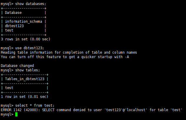 grant all privileges on dbtest123.* to test123@'%' identified by 'test123' with grant option;