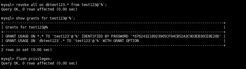 revoke all on dbtest123.* from test123@'%';