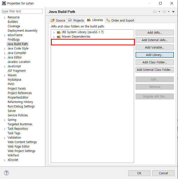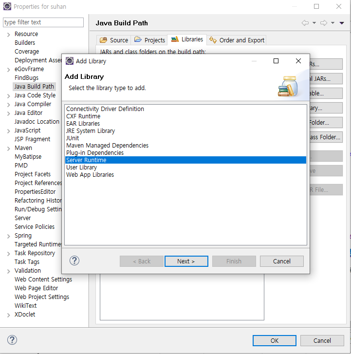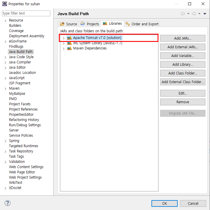 1. 해당 프로젝트 에서 우클릭 > Properties > Java Build Path > Libraries 에 Apache Tomcat 이 있는 지 확인