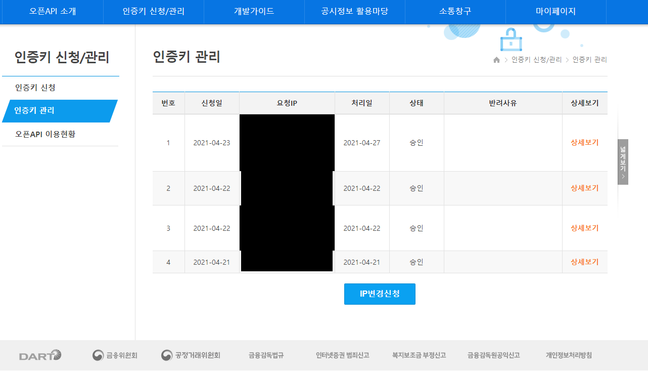 우선 opendart.fss.or.kr 주소로 접속하여 회원 가입 및 인증키를 발급 받아야 합니다.