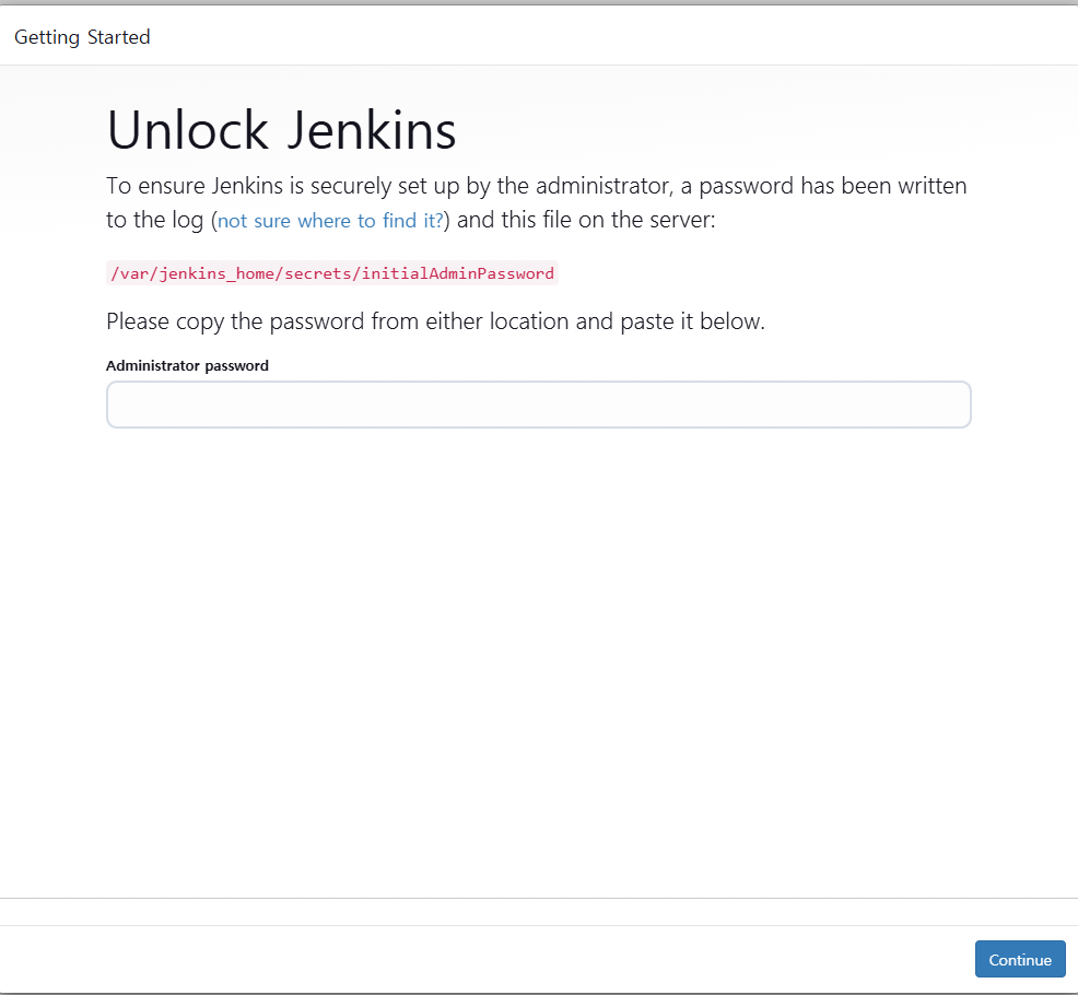 그러면 저기 Administrator Password 에는 /var/jenkins_home/secrets/initialAdminPassword 해당경로를 들어가 보면 키값이 있을 것입니다. 해당 키 값을 입력하고 Continue 를 입력하시면 됩니다.