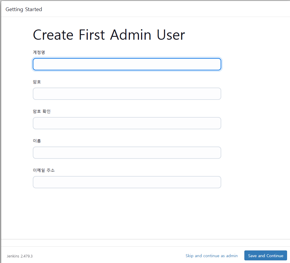 완료가 되면 아래와같이 ID , PW 를 입력하는 페이지가 나옵니다. 본인이 앞으로 Jenkins 에 로그인할 아이디와 패스워드를 적어주시면 됩니다.