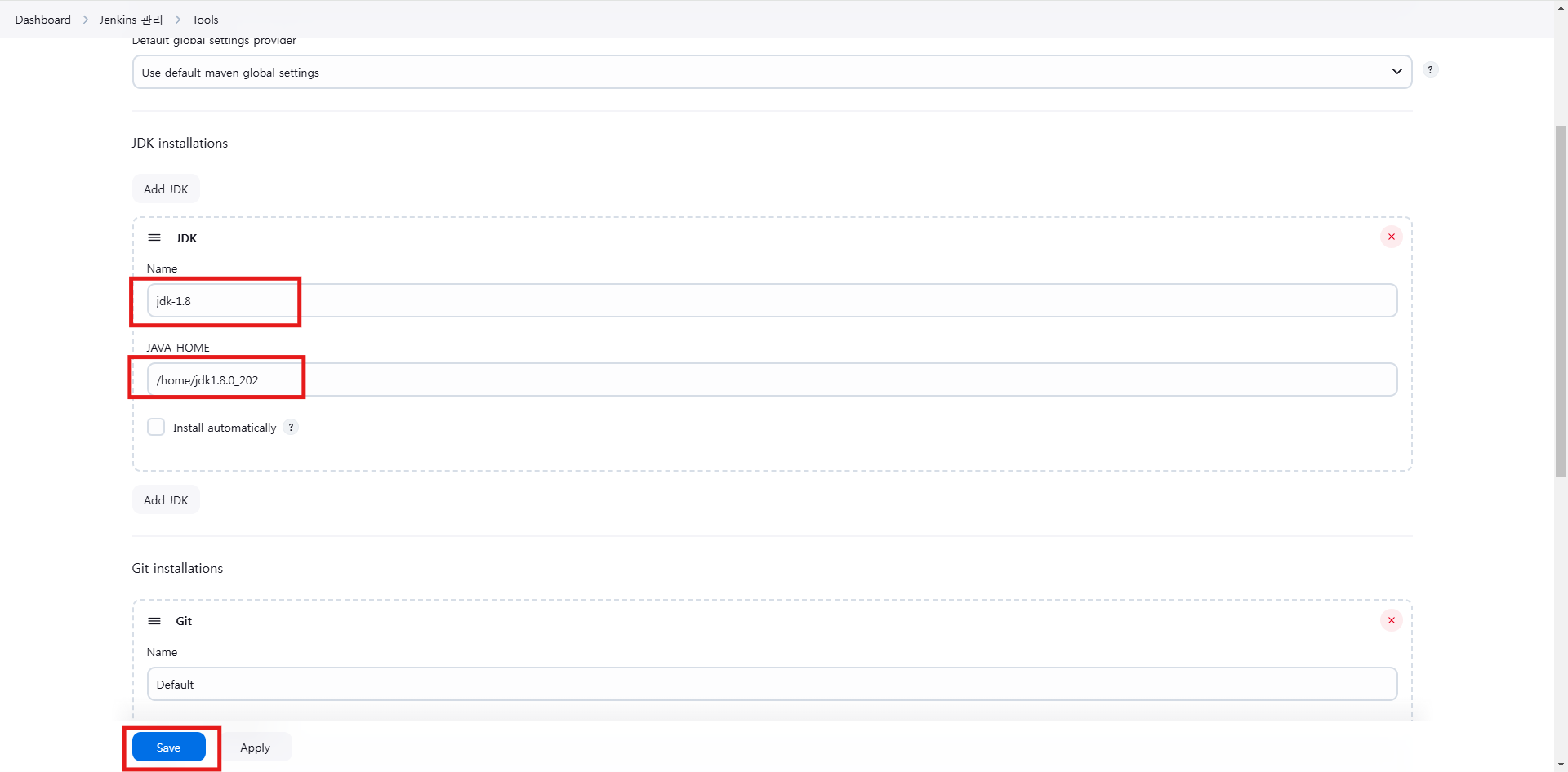 Name 과 JAVA_HOME 을 적어주고 SAVE 버튼을 눌러서 저장합니다.