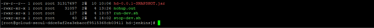 정상적으로 파일이 올라간것을 확인하였습니다. 여기에 미리 만들어놓은 파일 run-dev.sh , stop-dev.sh 파일은 해당 hd-0.0.1-SNAPSHOT.jar 파일을 시작과 종료를 할수있도록 미리 파일로 만들어 놓았습니다.