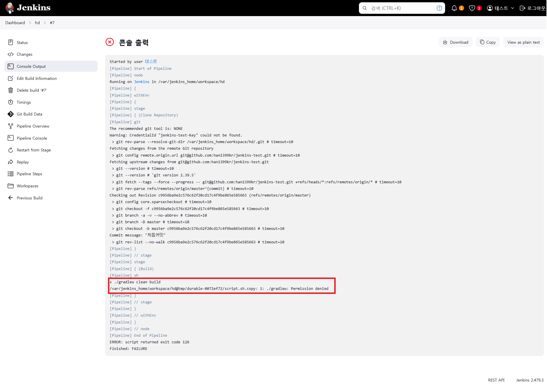 확인해 보니 권한이 없다는 내용이였습니다. 파이프라인에 권한을 추가해주고 다시 빌드 해봅시